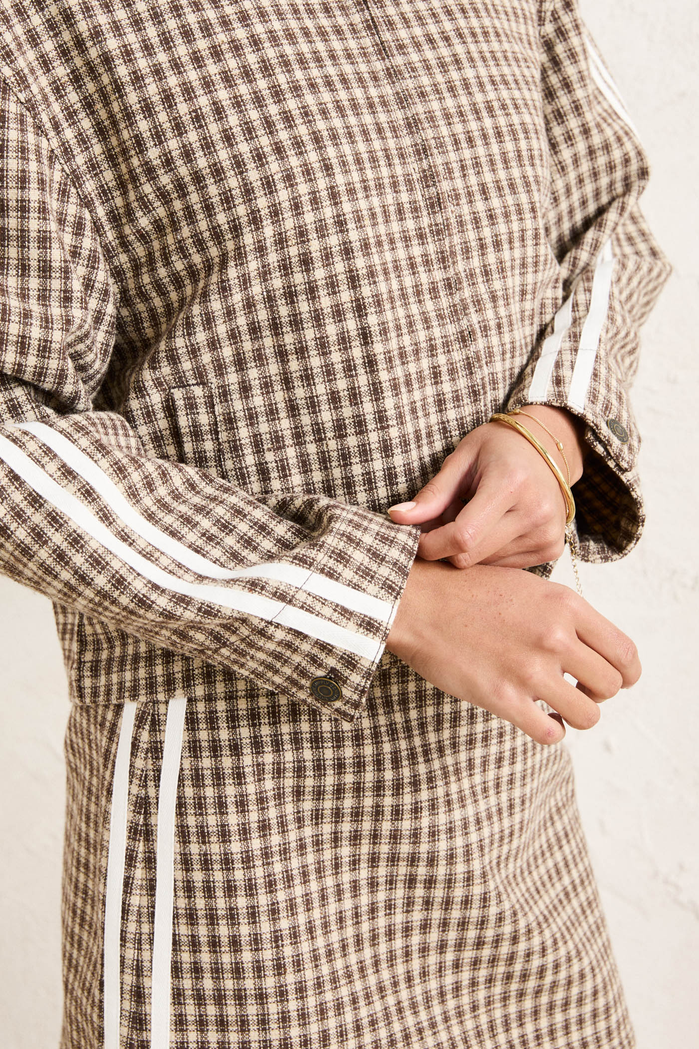 The Milly Crop Jacket in Brown is cut from check cotton with contrast binding and soft structure. Cropped and easy to layer, it adds charm and warmth to cooler coastal moments.
