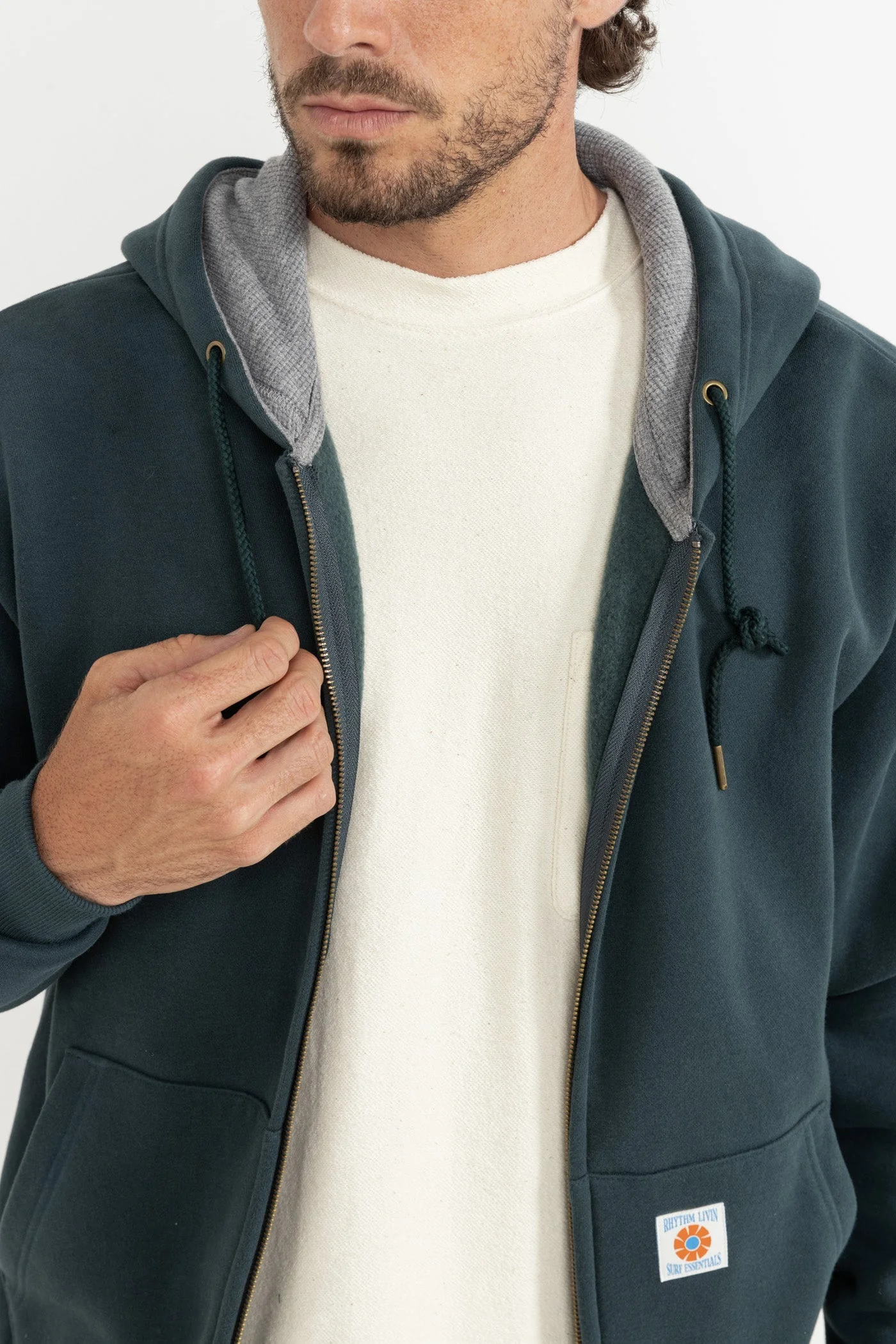 The Thermal Fleece Zip in Dark Pine offers warmth and structure in a versatile silhouette. A waffle-lined hood, metal zip closure, and patch hand pockets ensure function and style, while a Rhythm patch label adds a signature finish.